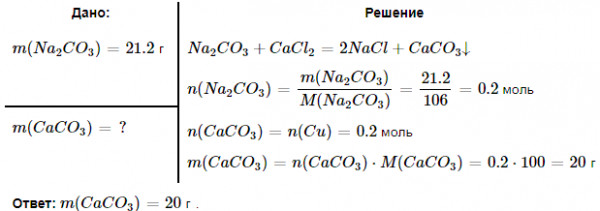 Вычислите массу осадка, образовавшегося при взаимодействии двух растворов, один из которых содержит 21,2 г карбоната натрия, а второй – хлорида кальция в стехиометрическом соотношении.