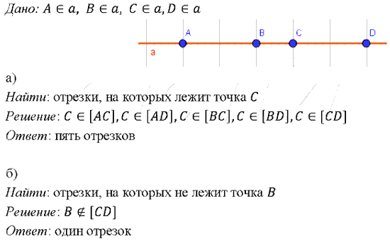 На рисунке 10 изображена прямая, на ней отмечены точки А, В, С и D. Назовите все отрезки: а) на которых лежит точка С; б) на которых не лежит точка В.