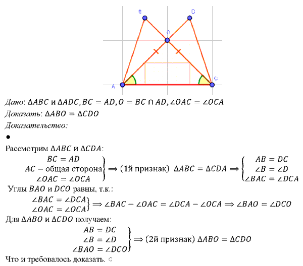 В треугольниках АВС и ADC стороны ВС и AD равны и пересекаются в точке О, ∠OAC = ∠OCA. Докажите,