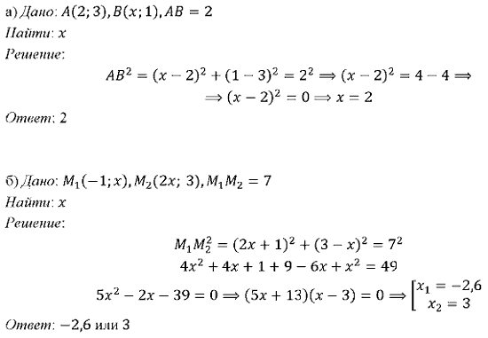 Найдите х, если: а) расстояние между точками А (2; 3) и В (х; 1) равно 2; б) расстояние между точками М1 (-1; х) и М2 (2х; 3) равно 7.