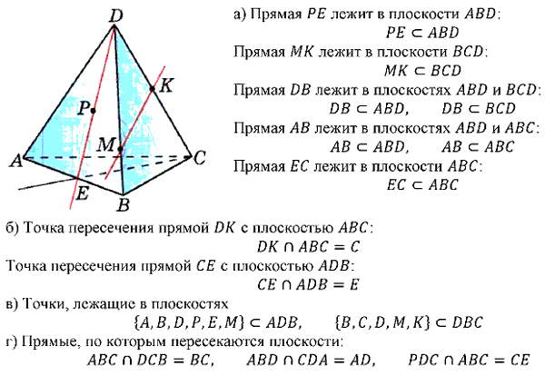По рисунку 8 назовите: а) плоскости, в которых лежат прямые РЕ, МК, DB, АВ, ЕС; б) точки пересечения прямой DK с плоскостью ABC, прямой СЕ с плоскостью ADB; в) точки, лежащие в плоскостях ADB и DBC; г) прямые, по которым пересекаются плоскости ABC и DCВ, ABD и CDA, PDC и ABC.