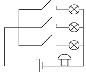 В больнице в комнате дежурной сестры находятся электрический звонок и три лампы. Начертите схему цепи, которая позволила бы вызвать сестру больным, лежащим в трех разных палатах.
