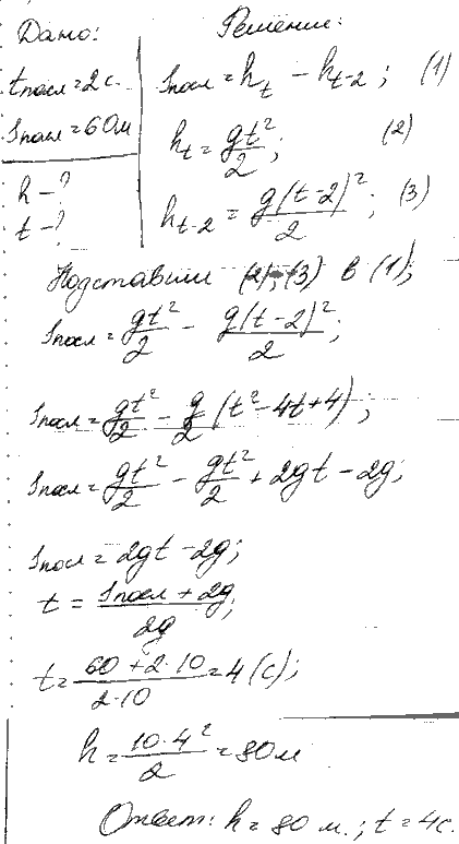 Определите время падения тела на землю, если за последние 2 с движения оно прошло 60 м. С какой высоты падало тело?