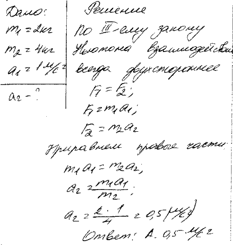 При столкновении двух тележек массами m1 = 2 кг и m2 = 4 кг первая получила ускорение, равное 1 м/с2. Определите модуль ускорения второй тележки.