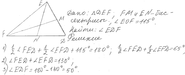 Биссектрисы углов Е и F треугольника DEF пересекаются в точке О. Найдите угол EDF, если ∠EOF = 115°.