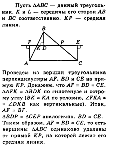 Докажите, что вершины треугольника равноудалены от прямой, на которой лежит его средняя линия.