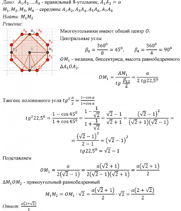 В правильном восьмиугольнике, сторона которого равна а, последовательно соединили середины четырех сторон, взятых через одну. Найдите сторону образовавшегося квадрата.