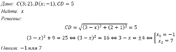 При каком значении х расстояние между точками С (3; 2) и D (х; -1) равно 5?