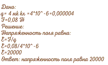Для определения напряженности электрического поля в некоторую его точку помещают пробный заряд q= 4 мк Кл .Со стороны поля действует сила, равная 0,08H . Чему равна напряженность поля указанной точке.
