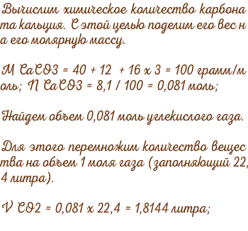 При пропускании углекислого газа через раствор гидроксида кальция образовался известняк массой 8.1г. Определите объём углекислого газа.
