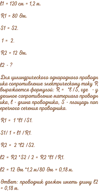 Проводник длиной 120 см имеет сопротивление 80 Ом. Какой длины нужно взять проводник того же материала и той же площади поперечного сечения, чтобы его сопротивление было 12 Ом?