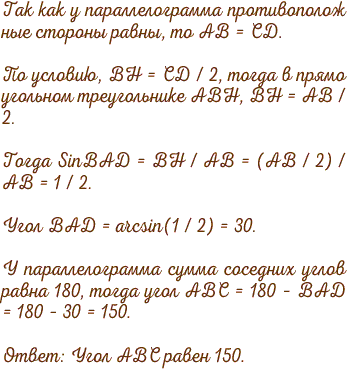 В параллелограмме ABCD высота ВН в два раза меньше стороны СD. Найдите градусную меру угла АВС.