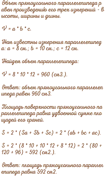 Найдите объем и площадь поверхности прямоугольного параллелепипеда если его измерения равны 8 см., 10 см., 12 см.