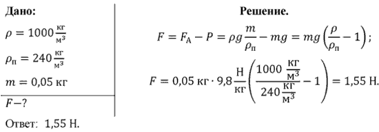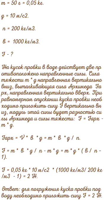 Какую силу необходимо приложить для того, чтобы погрузить под воду кусок пробки массой 50г?