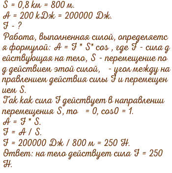 Сила, действующая на пути 0,8 км в направлении движения, совершила работу 200 кДж. определите модуль этой силы